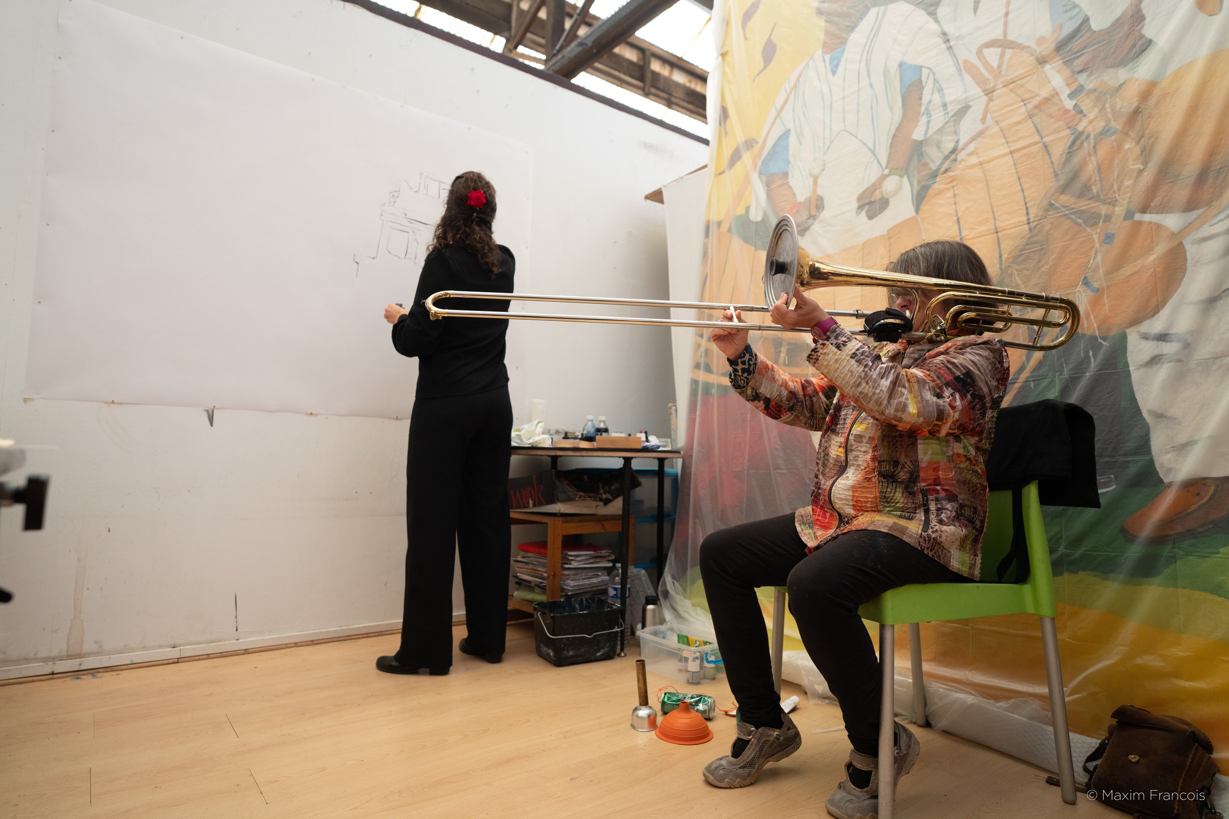 Au cœur des ateliers et des œuvres en cours, les musiciens s’inspirent de l’espace, des matières, des gestes créateurs et des œuvres présentes pour construire une performance sonore spontanée. En retour, les plasticiens réagissent, interviennent ou laissent leurs créations vibrer sous l’effet de cette ambiance inédite. Ce moment est l’occasion de vivre l’art dans sa forme la plus vivante, fragile et libre — un échange brut, immédiat, et toujours en mouvement.